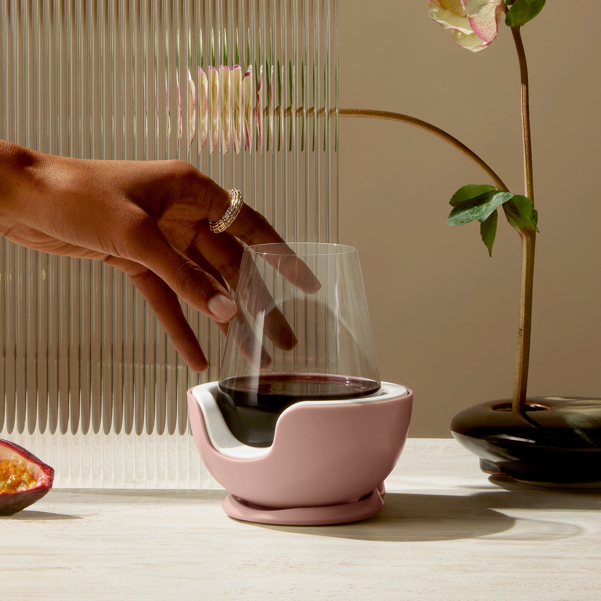 one stemless wine glass chiller plus one stemless extra chill cradle in rose color against a white backgroundStemless Wine Chiller + Extra Chill Cradle™ Rose