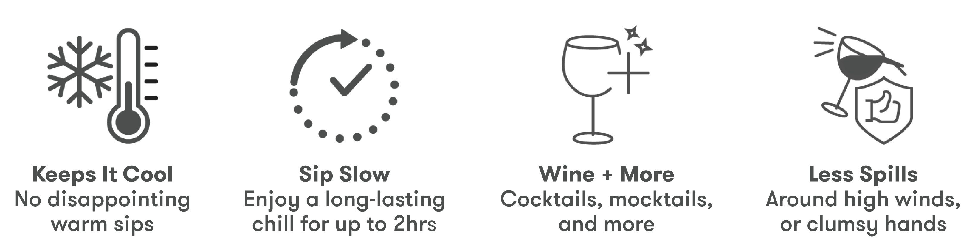 Our Stemless Wine Glass Chiller actively chills one glass of wine (or a few) for two hours inside, and for up to an hour in shaded outdoor heat.
